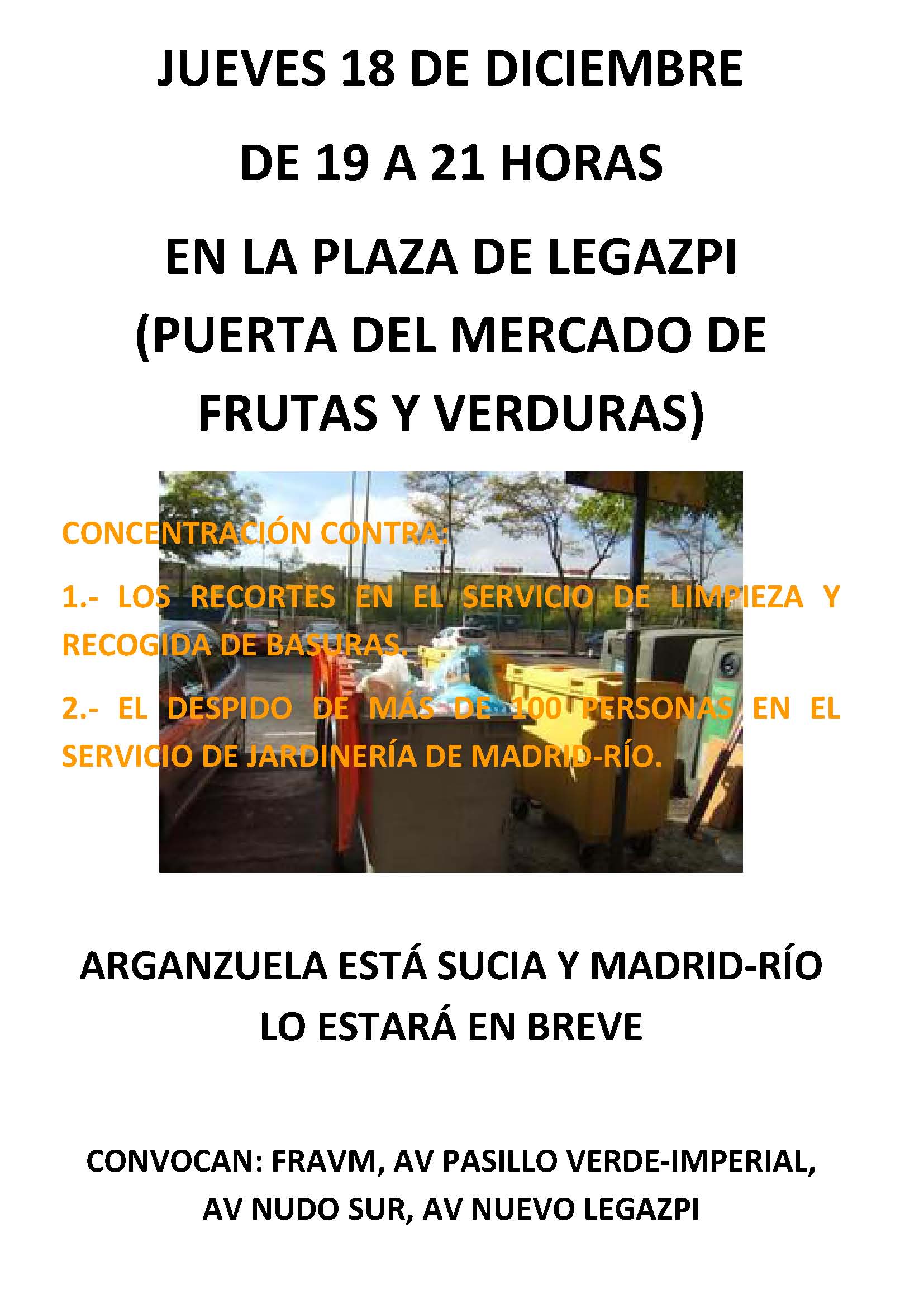 1) Mañana jueves de 19 a 21 horas la protesta por la suciedad del distrito en la Plaza de Legazpi, en la puerta del mercado de frutas y verduras. Nosotras apoyamos y cedemos el equipo de música.